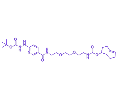 HyNic-PEG3-TCO 是一种具备双功能基团的生物正交反应试剂,其分子结构包含反式环辛烯(TCO)、肼烟酸(HyNic)及聚乙二醇 3(PEG3)链段,可分别通过生物正交反应与腙键形成实现生物分子的高效偶联与修饰,适用于 ADC 开发、生物材料功能化等多领域应用,且在低温干燥避光条件下保持稳定。 反式环辛烯(TCO)基团可与四嗪(Tetrazine)类化合物发生无催化剂、生理条件下的快速生物正交反应,该特性使其在活体生物分子标记、细胞内信号通路研究等前沿领域具有显著优势。肼烟酸(HyNic)基团能够与含羰基的醛、酮类化合物在温和条件下特异性结合,形成稳定的腙键,为生物分子的修饰、偶联及靶向递送提供了灵活且高效的化学途径。聚乙二醇 3(PEG3)链段相较于短链 PEG(如 PEG2),通过增强分子亲水性与空间位阻效应,可有效降低非特异性吸附,提升生物相容性,并延长分子在体内的循环时间,进一步优化其在生物体系中的应用性能。 该试剂凭借独特的结构设计,在抗体-药物偶联物(ADC)开发中可实现抗体与 payload 的精准连接,在生物材料表面功能化修饰中确保活性分子的定向固定,在放射性药物标记及生物传感器构建中提供高效稳定的化学偶联方案,是生命科学研究与生物医药开发领域的关键工具分子。