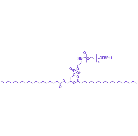 DSPE-PEG-GEBP11是一种由DSPE(二硬脂酰基磷脂酰乙醇胺)、PEG(聚乙二醇)与GEBP11多肽共价偶联形成的功能性复合物,在靶向药物递送系统和生物医学研究中展现出重要应用潜力。其设计整合了磷脂衍生物的生物相容性、PEG的长循环特性以及多肽的靶向识别功能,可通过构建智能递送载体提高药物的治疗效果并降低对正常细胞的毒性。