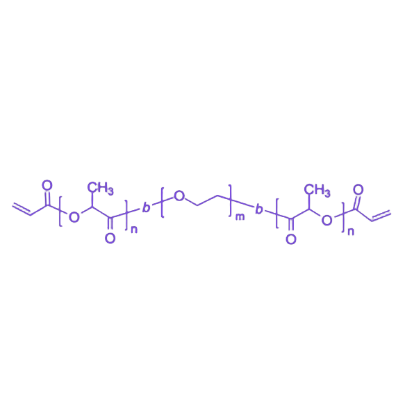 Acryl-PLA-PEO-PLA-Acryl 是一种可聚合型三嵌段共聚物,分子结构以 ABA 型 PLA-PEO-PLA 为主链,两端修饰丙烯酸基(Acrylate),兼具生物可降解性、良好水化能力及可交联性,可构建稳定的水凝胶、薄膜、纳米网络或可植入材料,广泛适用于药物递送、组织工程与智能响应材料领域。