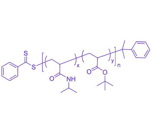 P(NIPAM-co-tBA)是一种由N-异丙基丙烯酰胺(NIPAM)和丙烯酸叔丁酯(tBA)通过自由基共聚制备的智能无规共聚物,集成了温敏性与化学转化潜力,可作为功能前驱体材料扩展智能响应范围,在生物医用及智能材料领域具有重要应用价值。 该共聚物的核心特性源于两种单体单元的协同作用:NIPAM组分赋予其类似聚(N-异丙基丙烯酰胺)(PNIPAM)的温度响应性,在约32°C的较低临界溶解温度(LCST)附近发生可逆的亲水-疏水转变,且LCST值可通过调节NIPAM与tBA的共聚比例实现精准调控;tBA组分则提供类似聚(丙烯酸叔丁酯)(PtBA)的化学转化潜力,其叔丁酯基团在温和酸性条件下可水解为强亲水性且具有pH响应性的聚丙烯酸(PAA)链段,使共聚物从单一温敏性转变为兼具温度和pH双重响应的P(NIPAM-co-AA)。 合成方面,采用自由基共聚法制备,产品分子量分布(PDI)通常控制在1.5-2.5范围内,确保聚合物结构与性能的可调控性。这种特性组合使其在智能药物控释系统、组织工程支架构建、高灵敏度传感器开发及功能分离膜制备等前沿领域展现出独特优势,为多响应性智能材料的设计与应用提供了灵活且高效的解决方案。
