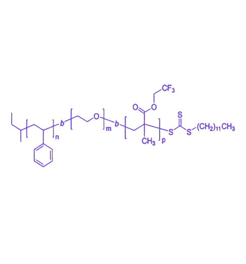 PS-b-PEO-b-PTFEMA 是由聚苯乙烯(PS)、聚乙二醇(PEO)和含三氟乙基甲基丙烯酸酯侧链的氟聚合物(PTFEMA)构成的 三嵌段共聚物,其通过三段链段的协同作用,在 溶液自组装、界面工程、抗污涂层及纳米结构构筑等领域展现出突出的性能组合。各链段分别提供刚性疏水骨架、亲水柔性链段及低表面能功能段,通过调节分子量比可实现微相结构的精准调控,在水性分散、薄膜构筑、纳米复合材料等方向具有重要应用价值。