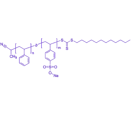 PS-b-PSSNa是一种以“聚苯乙烯(PS)-化学键连接-聚苯乙烯磺酸钠(PSSNa)”为线性两嵌段核心结构的功能材料,具备优水溶性、离子交换能力、可控成膜性及静电稳定特性,在日化添加剂、水处理剂、导电材料及离子交换膜领域具有关键应用价值。其分子设计通过疏水刚性PS链段与强离子性PSSNa链段的协同作用,实现结构稳定性与界面调控功能,同时可通过链段比例调控自组装行为,适用于多类离子调控与分散稳定场景。 疏水刚性的PS链段(玻璃化温度约105℃)为材料提供结构稳定性与机械强度,其苯环可通过疏水作用锚定在粉体表面或形成胶束核,有效提升材料在分散体系中的界面结合力。含磺酸钠基(-SO₃Na)的PSSNa链段(玻璃化温度约210℃)具有强离子性与亲水性,磺酸钠基可完全电离,在水溶液中形成密集负电层,通过静电斥力实现颗粒分散或胶体稳定。 因两嵌段热力学不相容性,PS-b-PSSNa在水溶液中可自组装形成核-壳胶束结构,其中PS为疏水核、PSSNa为亲水壳,胶束粒径可通过PS/PSSNa链段比(通常n:m=1:2至1:5)调控在80-250nm范围。材料分子化学稳定性优异,在pH 3-11范围内无降解,经GPC检测分子量分布系数(PDI)可控制在1.2-1.6的窄分布范围,为其在离子交换、分散稳定等应用场景中的可靠性提供保障。