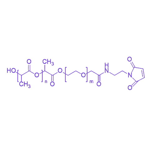 PDLLA-PEG-MAL 是一种通过化学修饰将 聚D,L-丙交酯(PDLLA)、聚乙二醇(PEG)与马来酰亚胺(MAL)共价连接的功能化生物可降解聚合物,其模块化设计可实现精准修饰与功能化,适用于靶向药物递送、生物成像及多功能生物材料构建等领域。 该聚合物的核心组分赋予其多重特性:PDLLA作为主体链段提供快速生物降解性能,确保材料在体内可逐步代谢;PEG链段显著改善材料的亲水性与生物相容性,降低非特异性蛋白吸附;末端修饰的MAL基团则通过硫醇-马来酰亚胺反应(Michael加成),实现与含巯基(-SH)生物分子(如抗体、多肽、荧光探针等)的特异性共价偶联,为生物分子的高效固定与功能整合提供关键化学基础。