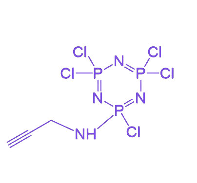核心结构由六氯环三磷腈(HCTP)提供含氮、磷的环状骨架,该结构因磷氯键存在而具有高反应活性;通过亲核取代反应引入的丙炔胺基团则带来强亲核性炔基,可参与点击化学反应等多样化转化。