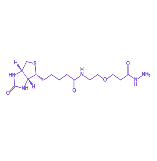 Biotin-PEG1-HZ 是一种由 生物素(Biotin)、单聚乙二醇链(PEG1)和 肼基(Hydrazide,HZ)构成的功能化分子,通过 HZ 端与醛基或酮基的特异性缩合反应形成稳定腙键,实现生物素标签的高效引入,为分子捕获、检测及固定提供关键功能位点。其核心结构设计赋予多重优势:生物素部分可与链霉亲和素或亲和素形成高亲和力结合,确保检测与分离过程中信号的特异性和稳定性;PEG1 链段提供适度柔性与亲水性,有效减少标记时的空间位阻;HZ 端则能与羰基化分子高效偶联,在生物标记、表面修饰及分子探针开发中展现显著应用价值。 该分子主要适用于含醛基或酮基分子的生物素化修饰,例如多糖、氧化处理后的糖蛋白及醛基修饰的纳米材料。借助生物素-链霉亲和素体系,可实现高效分子捕获、定向固定及信号放大。由于 PEG1 链段较短,Biotin-PEG1-HZ 特别适用于需要紧凑空间结构的分子体系,能够在修饰后维持目标分子的原有功能特性,是生物化学与材料科学研究中的重要工具分子。