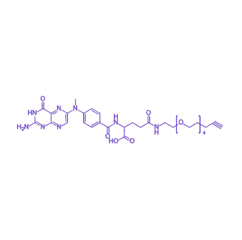 Folate-PEG4-Alkyne 是一种由叶酸、四聚乙二醇(PEG4)和丙炔基构成的功能性化合物,兼具靶向识别、生物相容性增强及高效偶联反应能力,适用于生物医用纳米材料的精准修饰与靶向递送研究。 该化合物分子结构中,叶酸部分可与生物体内特定受体特异性结合,为纳米材料提供生物靶向导向功能,实现其在生物体系中的精准定位与富集。PEG4片段作为亲水性间隔臂,显著提升分子的水溶性及生物相容性,有效改善纳米材料在生物环境中的分散稳定性,减少非特异性相互作用。丙炔基基团则赋予分子点击化学偶联活性,可在铜催化或无铜催化体系下与叠氮基团发生高效、高特异性的1,3-偶极环加成反应,形成稳定的1,2,3-三唑环结构,该反应具有条件温和、产率高、副反应少等特点,为纳米载体表面功能化修饰提供可靠的化学手段。