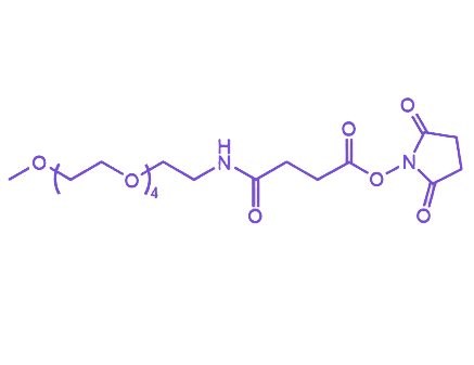 mPEG4-NHS 是一种具有明确结构的聚乙二醇衍生物,其核心特性由甲氧基封端的聚乙二醇链段与活性 NHS 基团共同赋予,在生物偶联、药物修饰及生物材料表面改性等领域展现出重要应用价值。 聚乙二醇(PEG)作为基础骨架,具备优异的生物相容性、低免疫原性及良好水溶性,甲氧基封端的聚乙二醇链段进一步赋予分子 亲水性 和 长循环特性,可有效降低生物体内非特异性吸附,延长循环半衰期。分子末端的 NHS 基团 具有高反应活性,能与含氨基(-NH₂)的分子发生 酰胺化反应,为功能化偶联提供高效化学途径。 在药物研发中,通过 NHS 基团与含氨基药物分子或生物活性分子偶联,可构建聚乙二醇化药物复合物,显著改善药物的药代动力学性质,提升疗效与稳定性。在生物材料领域,利用 NHS 基团与材料表面氨基的反应,可引入亲水性聚乙二醇链,优化材料生物相容性,减少蛋白质吸附与细胞黏附,降低免疫反应风险。