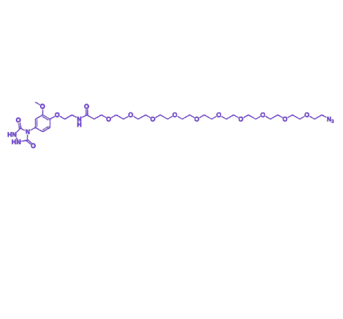 PTAD-PEG10-N3(4-苯基-1,2,4-三唑啉-3,5-二酮-聚乙二醇10-叠氮)是一种多功能化学偶联试剂,通过将PTAD反应基团、PEG10柔性链段与叠氮末端进行精准分子设计,实现了生物相容性与反应可控性的协同优化。该化合物在保持低分子量特性的同时,通过严格控制叠氮基含量,显著降低了潜在分解风险,在常规实验操作量、常温避光储存及无催化剂/还原剂参与的条件下展现出较高的使用安全性,适用于生物体系的精确修饰需求。 双端正交反应设计是该试剂的核心优势:PTAD基团可与富电子烯烃、炔烃等发生高效环加成反应,而叠氮基则适用于铜催化或无铜点击化学体系,两种活性端基针对不同化学环境实现特异性偶联,有效避免交叉反应。PEG10链段的引入不仅提升了化合物的水溶性与生物相容性,其适度的链长(约45-55原子长度)在增强分子柔性的同时,可通过空间位阻效应减少修饰位点的非特异性相互作用,为复杂生物分子偶联提供理想的连接臂。 该产品凭借≥95%的化学纯度和优异的存储稳定性,可广泛应用于药物递送载体的靶向修饰、荧光探针的生物分子标记、纳米材料的表面功能化等前沿研究领域。其独特的分子结构设计使得在温和反应条件下即可实现高效偶联,特别适用于对pH、温度敏感的生物活性物质修饰,为生物医药及材料科学研究提供可靠的化学工具。
