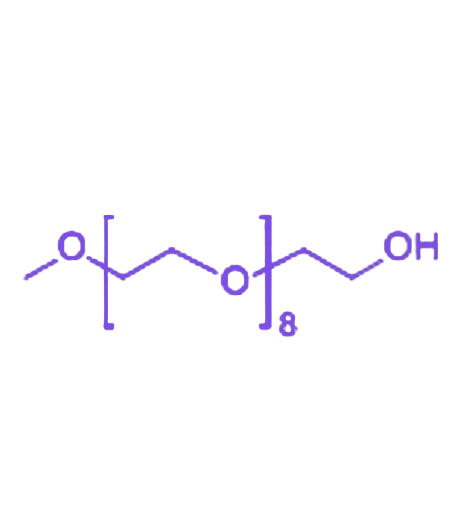 mPEG9-OH(九聚乙二醇单甲醚)是一种具有两亲性结构的聚乙二醇衍生物,其分子由疏水甲基、亲水羟基及9个乙二醇单元连接构成,具备良好的溶解性、反应活性与热稳定性,在生物医药和材料科学领域具有重要应用价值。 分子结构呈现一端为疏水甲基(-CH₃)、另一端为亲水羟基(-OH)的特征,中间通过9个乙二醇单元(-CH₂CH₂O-)连接形成线性链段,这种独特的两亲性结构赋予其在界面调控中的关键作用。外观通常为无色至淡黄色粘稠液体,低温下可凝固为蜡状固体,具有良好的热稳定性,能在较宽温度范围内保持化学性质稳定。 化学式为C19H40O10,分子量约为392.51,具备优异的溶解性能,不仅易溶于水,还可与乙醇、丙酮等多种有机溶剂混溶,为不同体系中的应用提供了便利。分子末端的羟基(-OH)使其具有高度的反应活性,可参与酯化、醚化等多种化学反应,为功能化修饰提供丰富的化学位点。 在生物医药领域,常用于蛋白质、多肽等生物分子的PEG化修饰,通过共价结合改善生物分子的稳定性、延长半衰期并提升生物相容性;在材料科学领域,作为表面改性剂可精准调节材料的亲疏水性,为制备具有特定界面性能的功能性纳米材料提供重要支撑。