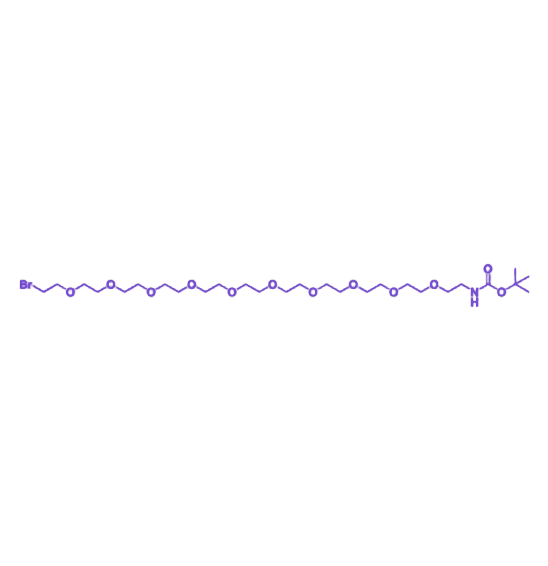 分子结构由三部分构成:一端为溴代基(Br–),作为优良亲电反应位点;中间为含约10个乙二醇重复单元的PEG10 主链,提供柔韧、亲水且具有空间延展性的分子骨架;另一端为Boc 保护的氨基(–NHBoc),初始呈惰性,脱保护后可实现氨基化偶联。