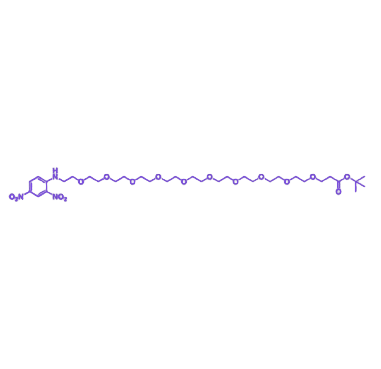 DNP-PEG10-COOtBu 是一种整合了发色基团、酸敏感保护基与超长亲水链段的多功能分子探针,其独特结构设计使其在有机合成与材料化学领域具有广泛应用潜力。该分子通过模块化构建实现了光谱可追踪性、选择性脱保护功能与亲水性调节的协同整合,为复杂分子组装提供了高效的结构单元。 分子结构由三个功能区域构成:一端为2,4-二硝基苯基(DNP),作为强紫外吸收发色团,不仅可作为光谱检测探针,还具备光化学转化与还原响应特性;中部为聚乙二醇10(PEG10)链段,由十个乙二醇单元组成的超长亲水间隔臂,显著提升分子极性与链段柔顺性,增强在水相及极性有机溶剂中的溶解性能,同时通过空间位阻效应有效隔离两端功能基团;末端为叔丁酯基团(COOtBu),作为羧酸的酸敏感保护形式,可在三氟乙酸等酸性条件下发生选择性断裂,定量释放自由羧基实现后续衍生化。 该化合物的核心优势在于其结构多功能性与可调控性:DNP基团的紫外特征吸收(λmax≈360nm)可用于反应过程实时监测;PEG10链段的亲水性与长链特性适用于构建界面修饰材料或生物相容性载体;酸敏感保护基的存在使分子可作为“潜伏型”羧酸前体,在多步合成中实现正交保护策略。典型应用场景包括:作为超长链间隔臂用于抗体药物偶联物(ADC)的连接子设计,通过调节PEG链长优化药物分子的药代动力学性质;作为可激活型功能单体参与水凝胶网络构建,利用酸触发脱保护特性实现材料降解或药物控释;作为模块化合成砌块用于制备DNP标记的多肽、糖缀合物等复杂生物分子,简化分离纯化流程并提高产物均一性。