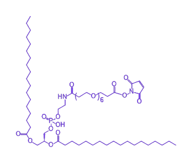 核心功能与应用价值 基于上述结构特性,DSPE-PEG6-Mal 可广泛应用于生物医药领域。在药物递送系统中,其自组装形成的脂质体载体可包载小分子药物或生物制剂,PEG 修饰延长体内循环时间,Mal 基团则可进一步偶联靶向配体(如抗体或肽段),实现药物的靶向递送,提高治疗效率并降低毒副作用。在生物检测领域,该化合物可作为连接臂将生物识别分子(如抗体、适配体)固定于纳米载体表面,构建高灵敏度的检测探针,用于疾病标志物的快速检测。此外,在生物材料修饰方面,通过 Mal 基团与材料表面或内部的巯基分子偶联,可赋予材料特定的生物功能(如细胞粘附、抗凝血等),拓展生物材料的应用范围。