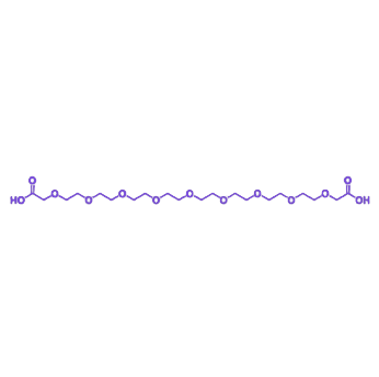 COOH-CH2-PEG9-CH2-COOH是一种以“羧甲基(-CH2COOH)-聚乙二醇9(PEG9)间隔臂-羧甲基(-CH2COOH)”为对称核心结构的化合物,其核心优势在于结合了“对称双羧基同步修饰”特性与聚乙二醇9的“短链低阻、高水溶性、亲水缓冲”性能,可作为连接双氨基/双羟基分子与对称修饰体系的“短链对称亲水桥梁”,广泛适配小分子药物双位点PEG化、对称载体表面双功能化、生物分子对称偶联等场景。