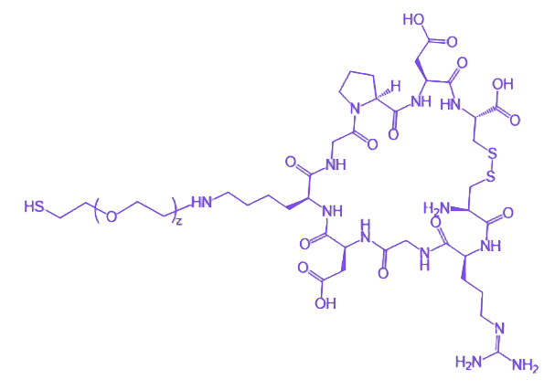 HS-PEG-iRGD是一种由巯基(HS-)、聚乙二醇(PEG)链段与靶向穿膜肽iRGD共价偶联形成的功能性生物材料,兼具靶向识别与跨膜递送双重特性,在精准药物递送系统研发中具有重要应用潜力。 该产品分子结构以线性PEG链为连接骨架,一端通过稳定醚键连接靶向穿膜肽iRGD序列(CRGDK/RGPD/EC),另一端修饰反应性巯基基团,可通过硫醇-马来酰亚胺点击化学或金纳米颗粒表面修饰等方式实现与药物载体的高效偶联。其物化性质表现为良好的水溶性与生物相容性,动态光散射法测得水合粒径通常低于50 nm,在pH 6.5-7.4生理环境下保持结构稳定。作为药物递送系统的关键组件,靶向穿膜肽iRGD通过与肿瘤微环境高表达的αvβ3/αvβ5整合素特异性结合,触发受体介导的细胞内吞作用,同时其C端序列可激活细胞表面蛋白酶,促进载体穿透肿瘤基质屏障;聚乙二醇链段则通过立体位阻效应减少网状内皮系统清除,延长循环半衰期;而末端巯基基团为载体功能化提供了高效反应位点,可实现化疗药物、siRNA或成像探针的定点偶联,在肿瘤靶向治疗、基因递送及分子影像等领域展现出独特优势。
