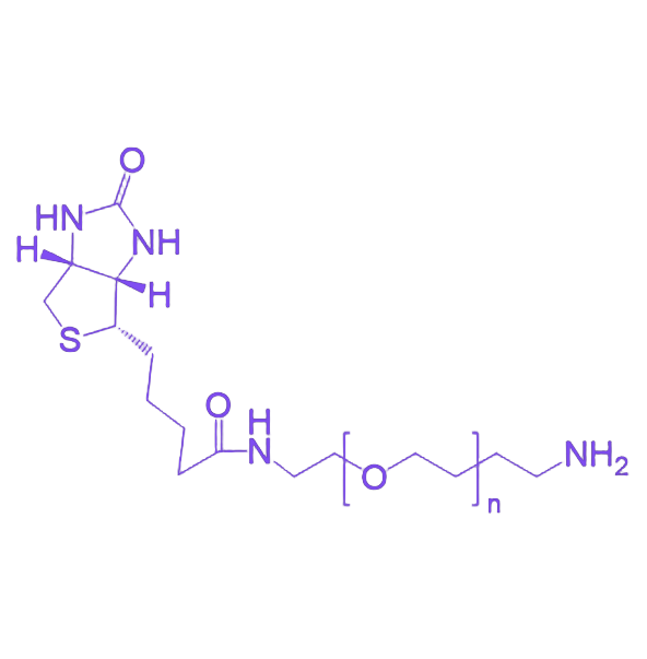 Biotin-PEG-NH₂(生物素-聚乙二醇-氨基)是一种具有生物靶向功能与生物相容性的多功能高分子偶联试剂,广泛应用于生物分子修饰、药物递送系统构建及生物检测分析领域。其分子结构中同时包含生物素基团、亲水性聚乙二醇链段和氨基活性基团,可实现靶向识别与高效偶联的双重功能。 该产品的分子结构由三个关键功能单元组成:末端的生物素基团可特异性结合链霉亲和素或抗生物素蛋白,形成高亲和力的非共价相互作用;中间的聚乙二醇(PEG)链段具有良好的水溶性和生物相容性,能有效减少非特异性结合并提高分子稳定性;另一端的氨基基团则可通过与羧酸、活性酯等官能团的化学反应实现共价偶联。在物化性质方面,产品通常呈现白色或类白色粉末状,易溶于水及多种极性有机溶剂,具体分子量可根据需求定制(常见范围为1000-20000 Da)。其独特的分子设计使其在生物医学领域展现出显著应用价值,例如作为靶向载体用于抗体-药物偶联物(ADC)的制备,通过生物素-亲和素系统实现药物的精准递送;或作为表面修饰剂对纳米材料、生物芯片等进行功能化改性,提升其生物相容性与检测灵敏度。