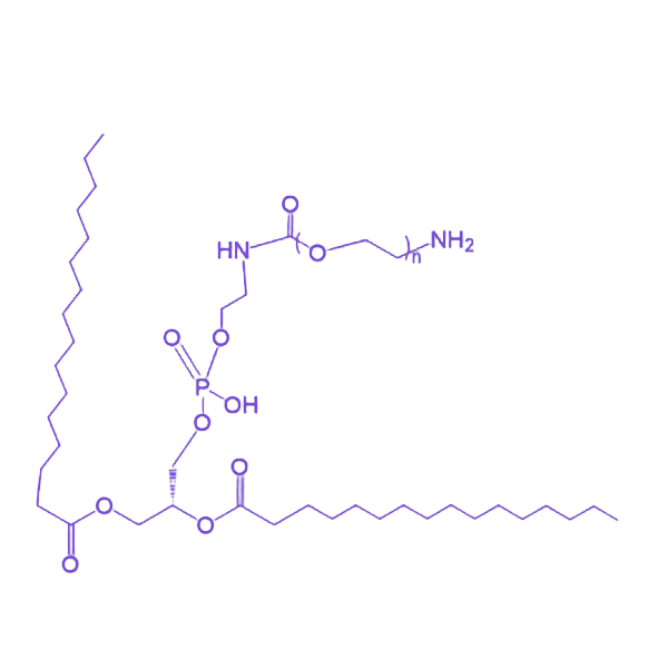 DPPE-PEG-NH₂(二棕榈酰基磷脂酰乙醇胺-聚乙二醇-氨基)是一种由磷脂与聚乙二醇链段共价偶联形成的功能性生物材料,其分子结构兼具两亲性与反应活性,在生物医学领域展现出独特的应用潜力。该产品通过精确调控磷脂疏水链长度与PEG分子量,可实现对材料界面性质和生物相容性的精准控制。 该化合物的分子结构由三部分构成:二棕榈酰基磷脂酰乙醇胺(DPPE)作为疏水端,提供细胞膜锚定能力;聚乙二醇(PEG)链段作为亲水头基,赋予材料优异的水溶性和空间位阻效应;末端修饰的氨基(-NH₂)则为其提供了与生物分子(如蛋白质、核酸)的偶联位点,可通过酰胺化等反应构建多功能生物缀合物。在物化性质方面,该材料具有明确的分子量分布和良好的热力学稳定性,其双亲分子结构使其能够自组装形成稳定的脂质体或胶束纳米载体,有效提高包载药物的血液循环时间。在应用价值上,DPPE-PEG-NH₂可广泛用于靶向药物递送系统的构建,通过氨基基团偶联靶向配体(如抗体、肽段)实现对特定细胞的精准识别,同时PEG链的修饰可显著降低纳米载体的免疫原性,为提高药物递送效率和治疗效果提供了重要工具。