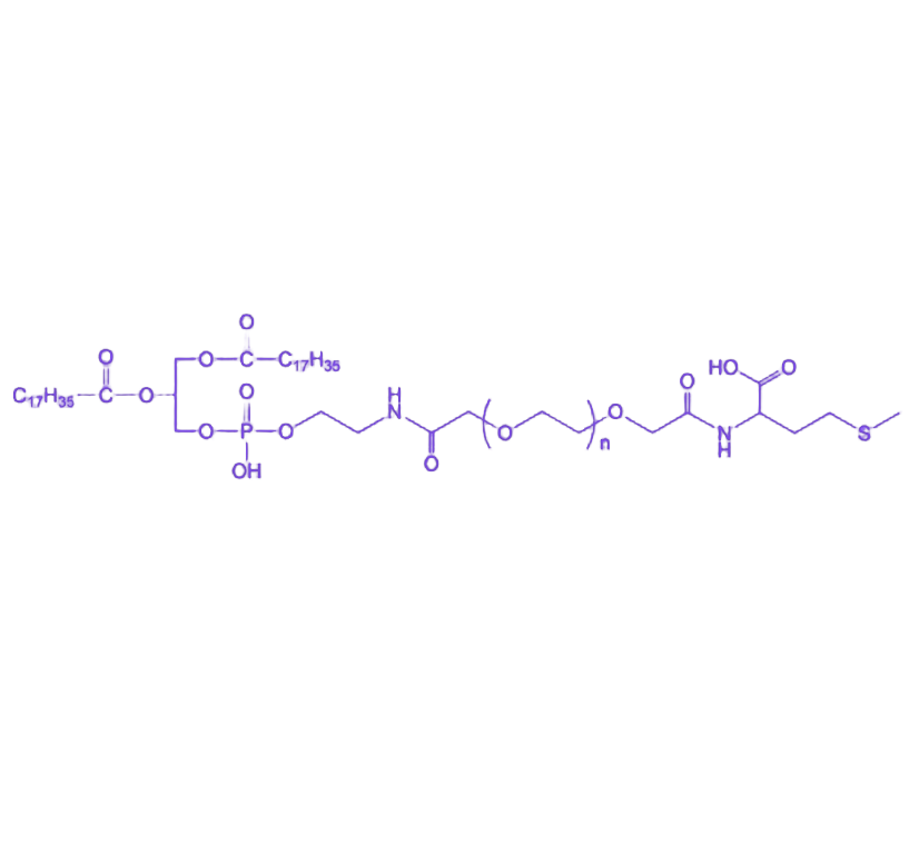 该化合物分子结构由三部分构成:疏水性的二硬脂酰磷脂酰乙酰胺(DSPE)片段、亲水性的聚乙二醇(PEG)链段,以及末端的DL-甲硫氨酸(DL-Methionine)基团。这种双亲性结构赋予其在水性介质中自组装形成纳米载药体系的能力,其中 PEG链段 可有效减少纳米颗粒的非特异性蛋白吸附,延长血液循环时间;而末端的 甲硫氨酸基团 作为生物活性配体,能够通过与特定受体的相互作用实现靶向递送。其物化性质表现为良好的水溶性与生物相容性,在pH 6.5-7.5的生理环境中可保持结构稳定,且具备可调节的PEG分子量与甲硫氨酸修饰比例,可根据具体应用需求进行定制化调整。在应用层面,该产品可作为载体材料包载小分子药物、核酸或成像探针,通过增强肿瘤部位的靶向富集效率,提高治疗效果并降低毒副作用,尤其在癌症的精准治疗与分子影像研究中具有显著优势。