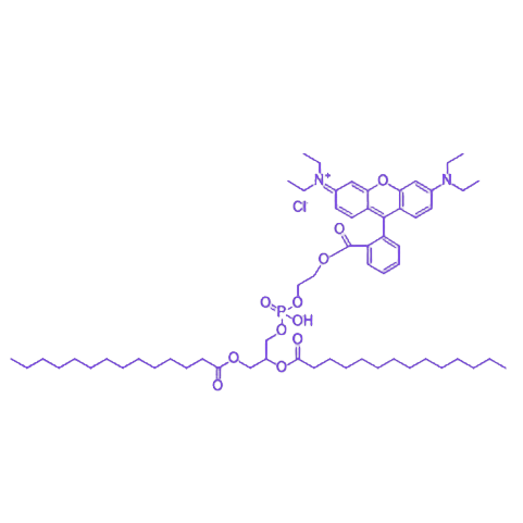 Rho-DMPE是由罗丹明(Rho)与1,2-二肉豆蔻酰-sn-甘油-3-磷酸乙醇胺(DMPE)通过化学连接形成的功能性复合物,兼具荧光示踪与生物膜兼容性双重特性,在生物医学研究领域具有重要应用价值。 该复合物中,罗丹明作为强荧光有机染料,可在特定波长激发光作用下产生清晰可检测的荧光信号,为其在细胞、组织及生物体内的分布与动态追踪提供可视化手段。DMPE作为磷脂分子,具有两条亲脂性脂肪酸链与一个亲水性磷酸乙醇胺头部基团的典型两亲结构,赋予其自组装形成脂质体等纳米结构的能力,并可稳定嵌入生物膜环境,为生物膜相关研究提供理想工具。 凭借罗丹明的荧光示踪功能与DMPE的生物膜亲和特性,Rho-DMPE可广泛应用于膜融合机制解析、脂质体药物递送过程监测、生物膜动态变化观察等研究场景,为生命科学领域的基础研究与应用开发提供关键技术支持。