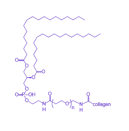 DSPE-PEG-collagen peptides 是一种由 二硬脂酰磷脂酰乙醇胺(DSPE)、聚乙二醇(PEG)与胶原蛋白肽(collagen peptides)共价结合形成的新型生物功能材料,兼具载体构建、靶向递送及生物活性调节多重特性,在药物传递、组织工程及美容护肤原料开发等领域展现出重要应用潜力。