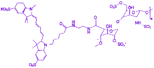 分子结构与理化特性方面,CY5荧光团通过化学偶联引入肝素链,在水溶液中维持肝素典型的聚阴离子特性。其紫外-可见吸收光谱在646 nm处呈现特征峰,荧光发射峰位于662 nm,近红外光谱特性可显著降低生物样品自发荧光干扰。标记反应过程中保留肝素糖链结构完整性,确保其与抗凝血酶III等生物大分子的特异性结合能力。荧光量子产率约为0.2-0.3,斯托克斯位移约16 nm,为高灵敏度检测提供光学基础。