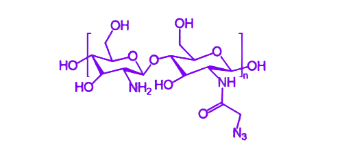 壳聚糖-叠氮是一类通过叠氮基团(-N3)修饰的天然高分子衍生物,其核心价值在于将壳聚糖的生物相容性与叠氮基团的点击化学反应性有机结合,为生物材料的精准功能化提供模块化设计平台。 该类化合物通常呈现白色至类白色粉末状,在弱酸性水溶液(如pH 4.0-6.0的醋酸溶液)中具有良好分散性,溶解度与脱乙酰度及叠氮取代度呈正相关。结构表征方面,傅里叶变换红外光谱(FTIR)中2100 cm⁻¹左右的特征吸收峰可证实叠氮基团的成功引入,¹H NMR谱中乙酰氨基质子信号(δ 1.8-2.0 ppm)与叠氮修饰位点质子化学位移的变化则用于表征取代度;热重分析显示其热分解温度较未修饰壳聚糖降低约20-30℃,源于叠氮基团的热不稳定性。 在前沿科研应用中,壳聚糖-叠氮主要通过点击化学(如Cu(I)催化的Azide-Alkyne环加成反应)实现生物活性分子的定点偶联。例如,在组织工程支架制备中,通过与炔基化生长因子的点击反应构建具有时空控释功能的仿生微环境;在药物递送系统中,其可作为载体骨架与炔基修饰的靶向配体偶联,通过增强细胞内吞效率提高治疗剂的生物利用度;此外,在生物成像领域,叠氮基团可与含炔荧光探针发生生物正交反应,实现对壳聚糖基材料在生物体内分布与降解过程的动态追踪。