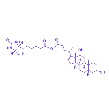 Biotin-DCA 是通过将 生物素 修饰于 脱氧胆酸 分子结构而获得的功能性化合物,该修饰策略在保留脱氧胆酸原有生理活性的基础上,赋予分子与亲和素或链霉亲和素的特异性高亲和力结合能力,为其在生物医学领域的靶向研究与应用奠定基础。 脱氧胆酸作为内源性胆汁酸,由肝脏通过胆固醇代谢途径生成,主要参与胆汁分泌调节及脂质代谢过程,具有明确的生理功能背景。生物素作为水溶性维生素,其独特的生物识别特性使其成为生物分子标记与分离领域的常用工具。Biotin-DCA 结合两者结构优势,既维持了母体化合物的生物相容性,又通过生物素基团引入可调控的靶向结合位点,可广泛应用于受体介导的细胞递送、生物分子探针构建及疾病诊断试剂开发等前沿研究方向。
