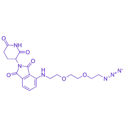 Pomalidomide 4'-PEG2-azide 是基于泊马度胺结构设计的功能化衍生物,通过在母核4'位引入双单元聚乙二醇(PEG2)链段及末端叠氮基(-N₃)修饰,实现小分子药物骨架、亲水链段与高反应活性基团的有机整合,适用于生物正交化学、分子探针合成及功能化材料构建等领域。 该分子的 PEG2 链段具有多重功能:提升分子水溶性与柔性,减少非特异性吸附,同时为偶联反应提供适宜分子间距,避免修饰位点与泊马度胺核心结构过近,保障偶联产物的空间稳定性与功能完整性。末端修饰的 叠氮基(-N₃)作为点击化学核心功能团,可在温和条件下与炔基分子发生高效环加成反应,生成稳定三唑键,该反应具备高选择性、高产率及优异生物环境兼容性,特别适用于纳米探针、分子成像试剂及药物递送系统中的标记与功能化改造。 凭借模块化结构设计、反应特异性及生物相容性优势,Pomalidomide 4'-PEG2-azide 在药物化学、纳米生物材料及化学生物学研究中展现出广阔应用前景。