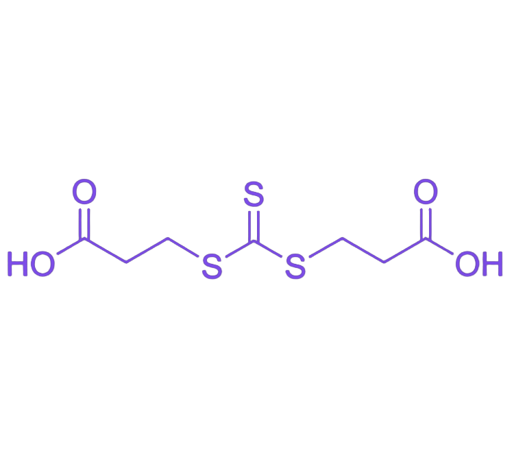 3,3'-(硫代羰基双(亚磺酰基))二丙酸(TCDPA)是一种结构高度对称的双羧酸官能化三硫代碳酸酯类RAFT链转移剂,其分子以三硫代碳酸酯为核心,两侧对称连接丙酸单元并末端带有羧基,兼具可控聚合活性与多重化学反应性,在功能高分子合成领域具有独特应用价值。 TCDPA的分子结构呈现高度对称性,核心三硫代碳酸酯基团两侧通过亚磺酰基连接丙酸链段,每个丙酸末端的羧基赋予分子双官能化特性,这种设计使其同时具备RAFT聚合控制能力与多元化学反应位点。作为双官能度试剂,TCDPA可从分子两端同步引发并调控链增长过程,直接合成分子量分布窄(PDI通常<1.3)、两端均含羧基的对称线型聚合物,为构建结构规整的功能材料提供精准分子前体。 双羧基末端是TCDPA实现多功能应用的关键,两个羧基可独立或协同参与化学反应:与二胺类化合物通过酰胺键缩合可形成三维交联网络,用于制备高强度水凝胶;与Ca²⁺、Fe³⁺等金属离子发生配位作用,能够构建具有自愈合性能或刺激响应性的金属配位聚合物;经中和反应转化为钠盐或铵盐后,TCDPA及其聚合物展现优异水溶性,满足水相可控自由基聚合需求,特别适用于生物相容性高分子或水处理絮凝剂的合成。 相较于单羧基RAFT试剂,TCDPA提供的双反应位点显著提升材料设计的官能团密度与结构多样性。在生物医学领域,双羧基可分别偶联靶向配体与药物分子,构建智能药物递送系统;能源与环境领域中,可通过羧基功能化制备高容量离子交换膜或重金属吸附材料。TCDPA的对称性与双功能化特性,使其从单纯的聚合控制工具发展为构建复杂功能材料体系的分子模块,推动RAFT技术向多功能集成材料设计方向演进。