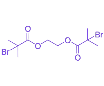 Ethylene bis(2-bromoisobutyrate)(EBiB)是一种结构对称的双官能团ATRP引发剂,其分子结构包含两个高反应性的α-溴代异丁酸酯基团,乙二醇链段赋予其优异的柔性与亲水性平衡,适用于合成结构明确的双嵌段、对称型及星形聚合物。 该化合物具备高引发效率与强反应可控性,通过精准调节单体与引发剂比例,可实现聚合物分子量及分子结构的精确调控。其双引发位点特性使其在高分子合成领域具有广泛应用,可用于制备对称聚合物、交联网络结构材料、高密度聚合物刷及功能性水凝胶等特种高分子材料,在生物医用材料、高端涂料及高性能粘合剂等领域展现出重要应用价值。