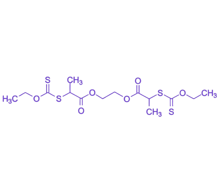 2-(乙氧基硫代羰基硫代)丙酸 2-[2-(乙氧基硫代羰基硫代)丙酰氧基]乙酯(简称BETBE)是一种以乙二醇为核心骨架的对称双官能度RAFT试剂,其分子结构通过酯键在两端连接2-(乙氧基硫代羰基硫代)丙酸单元,集成三硫代碳酸酯RAFT活性中心、柔性桥连结构及乙氧基Z基团等关键要素,可实现聚合物链的精准控制与多功能化应用。