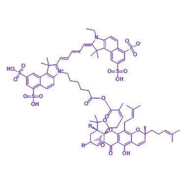 CY5.5-GA 是通过共价偶联技术将Cy5.5 近红外荧光染料与天然藤黄酸结合形成的功能性化合物,兼具荧光成像与生物活性双重特性,为生物医学研究提供了高效工具。 Cy5.5 作为关键荧光组件,其荧光激发峰和发射峰分别位于 680nm 和 710nm 近红外波段,具备高光学稳定性、良好生物相容性及 pH 不敏感性,可实现精准的生物成像与标记;藤黄酸作为天然活性成分,源自藤黄树提取,具有抗炎、抗氧化等多重生物活性。 该偶联物通过化学反应实现分子层面的稳定结合,将 Cy5.5 的近红外成像优势与藤黄酸的生物活性有机整合,可用于追踪藤黄酸在生物体内的分布动态、作用靶点定位及药效评估,为深入解析藤黄酸的体内行为及作用机制提供了技术支撑。