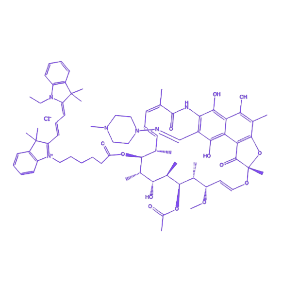 Cy3-Rifampicin是由荧光染料Cy3与广谱抗生素利福平偶联形成的复合探针,借助Cy3的橙红色荧光特性实现可视化追踪,同时保留利福平抑制GermRNA合成的抗菌活性,为研究药物的体内分布、转运机制及靶点相互作用提供直观分析工具,在生物医学和药物化学领域具有重要应用价值。 荧光标记特性:整合Cy3染料的优异荧光性能,在特定波长激发下发射明亮橙红色荧光信号,可通过荧光显微成像、流式细胞术等技术精确定位化合物在细胞或组织内的动态分布,实现实时示踪。 药理活性保留:母体化合物利福平的抗菌活性未受偶联反应显著影响,仍能特异性作用于GermRNA合成过程,有效阻断Germ生长繁殖,可同步用于药效学评价与作用机制研究。 化学稳定性控制:分子结构中糖苷键及双键等官能团对极端条件敏感,在强酸、强碱、高温或强氧化剂环境下易发生水解、氧化等降解反应,导致荧光淬灭或活性丧失。建议储存于干燥、避光、低温环境,以维持探针的结构完整性与功能稳定性。 该探针通过荧光-药效双重功能整合,为利福平类抗生素的药代动力学研究、靶向递送系统开发及抗菌机制解析提供了创新技术手段,适用于活体细胞成像、组织切片分析及模式生物体内示踪等多场景研究应用。