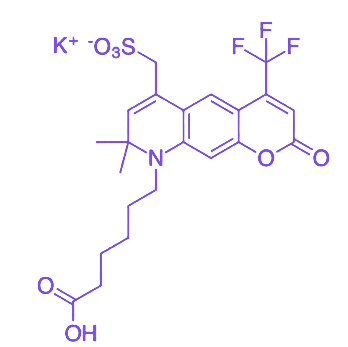 AF430-COOH 是 Invitrogen 公司开发的 Alexa Fluor 系列荧光探针中的一种荧光性能染料,具备优异的光学性能和化学稳定性,在生命科学研究领域应用广泛。其化学结构支持在 430nm 左右激发光下发射约 540nm 的黄绿色荧光,结合高荧光量子产率(0.8)及良好的光稳定性,可满足细胞动力学观察、活细胞实时追踪等长时程实验需求,有效避免荧光淬灭导致的信号衰减。 末端羧基(-COOH)作为活性官能团,使 AF430-COOH 可在缩合剂(如 EDC、NHS)催化下与含氨基生物分子(蛋白质、多肽、抗体、核酸等)发生共价偶联,通过形成稳定酰胺键实现高效荧光标记。该标记过程反应条件温和,能有效保留生物分子天然活性,标记产物可用于细胞成像、immunity分析、生物传感器构建等研究场景,凭借 高灵敏度 和 高分辨率 特性,实现从亚细胞结构观察到分子互作分析的多维度准确示踪与检测,为生命科学研究提供可靠的可视化工具。