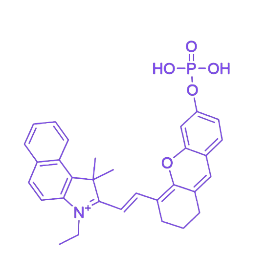 碱性磷酸酶(Alkaline Phosphatase, ALP)荧光探针是基于酶促催化去磷酸化反应原理设计的分子型荧光检测工具,通过磷酸酯保护基团的酶解触发荧光信号由“关闭”到“开启”的转变,实现对ALP的高灵敏可视化检测。该类探针在生物医学研究、临床诊断及药物筛选等领域具有重要应用价值。 探针基本结构由荧光发色团与磷酸酯保护基团共价连接构成,其核心工作机制在于:未被酶解时,磷酸基团通过空间位阻或电子效应阻断荧光团的共轭体系,导致探针荧光处于极弱状态;当暴露于ALP活性环境中,酶特异性催化磷酸酯键断裂,释放具有高发射能力的自由荧光团,使体系荧光强度显著增强,从而实现对ALP活性的实时动态监测。 在理化性质方面,该类探针通常具有良好的亲水性和化学稳定性,可溶于水-有机混合体系及多数弱极性溶剂,便于在细胞和组织内扩散渗透,适用于复杂生物样品的检测。光物理特性表现为激发波长可控分布于350–550 nm区间,发射波长覆盖450–700 nm的蓝光至近红光区域,可满足细胞成像、组织切片分析及活体荧光导航等不同场景需求。多数探针具备高量子产率和低自荧光背景,能够在低浓度条件下获得优异的信噪比,同时具有较强的光稳定性和抗光漂白能力,支持长时间连续成像观察。