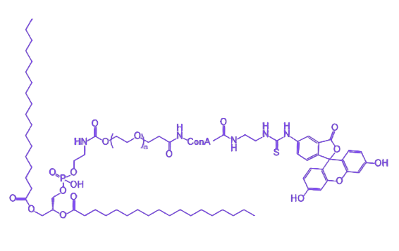 PEG 链段作为连接桥,一端与 DSPE 共价结合,另一端偶联 ConA 和 FITC,显著提升了复合物的水溶性与空间位阻效应。这一特性不仅减少了蛋白质的非特异性吸附,还能有效规避 immunity 系统的识别与清除,延长复合物在体内的循环半衰期。