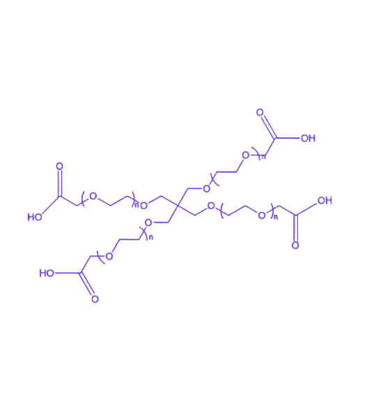 该化合物以四臂分支的聚乙二醇为主链,聚乙二醇链段赋予其优异的亲水性,可有效降低界面张力并提升材料在水性环境中的分散性;同时具备良好的生物相容性,能减少生物体系中的免疫原性与毒性反应,适用于细胞培养、药物递送等生物相关场景。四臂末端的羧基官能团(-COOH)提供了丰富的化学反应位点,可通过酰胺化、酯化等反应与含氨基(-NH₂)、羟基(-OH)等基团的分子或材料表面偶联,实现功能化修饰与复合体系构建。