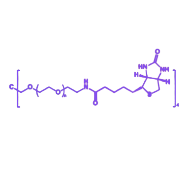 每个PEG臂末端共价连接的生物素基团具有独特的分子识别能力,能与亲和素链霉亲和素形成近乎不可逆的特异性结合(结合常数极高)。这种超稳定的生物素-亲和素相互作用体系,为构建免疫检测、细胞标记、药物靶向递送等生物共轭系统提供了可靠的分子基础,广泛适用于生物医学研究及生物技术开发领域。