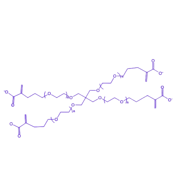 该材料的核心结构特征表现为四臂拓扑结构,其聚乙二醇链段赋予分子优异的亲水性和生物相容性,能有效降低界面吸附并提升材料在水相环境中的分散稳定性;末端修饰的甲基丙烯酸酯基团则提供了丰富的化学反应位点,可通过自由基聚合、点击化学等方式与各类单体或聚合物进行共价偶联,实现材料性能的精准调控。