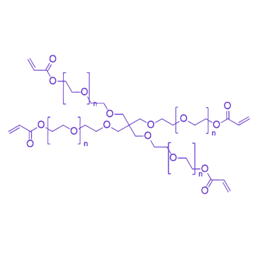 该化合物的分子结构以多臂聚乙二醇为基础,四臂 PEG 作为核心骨架提供了分子的基本架构与空间分布特性。丙烯酸酯(ACRL) 官能团修饰于每个臂的末端,赋予分子显著的反应活性,可在引发剂作用下发生自由基聚合反应,或与其他含双键化合物进行加成反应,为材料的化学修饰与功能化提供关键途径。