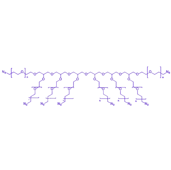 8 arm-PEG-N3 是一种以六甘油为核心的 多臂PEG衍生物,其八个臂末端均修饰有 叠氮(N3)基团,兼具良好的水溶性、生物相容性与化学反应活性,在生物医学及材料科学领域具有重要应用价值。 该化合物通过将八个PEG臂连接于六甘油核心形成分支结构,这种 八臂拓扑结构不仅显著提升了分子的水溶性和生物相容性,还提供了多个可反应位点,支持与多种分子或基团的同时结合。末端的叠氮基团赋予其 点击化学(Click Chemistry)反应特性,可与含炔烃基团的分子高效、特异性偶联,实现精准的分子修饰与功能化。 凭借多位点反应能力和优异的生物相容性,8 arm-PEG-N3 可作为 生物偶联剂用于药物递送系统构建、生物分子功能化修饰及新型材料表面改性,在靶向治疗、生物成像及纳米材料制备等场景中展现出独特应用潜力。