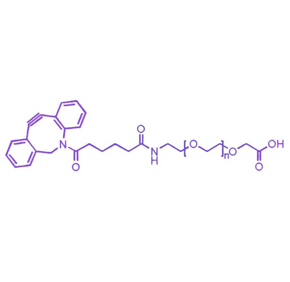 DBCO-PEG-acid(二苯基环辛炔-聚乙二醇-羧酸)是一类融合DBCO基团、PEG链段与羧酸基团的功能性化合物,凭借其独特的结构设计在生物偶联、材料修饰等领域展现出显著优势。其分子结构赋予的多重反应特性与生物相容性,使其成为生物医学及材料科学研究中的重要工具分子。 DBCO基团具有刚性结构,赋予化合物高效的点击化学反应特性,在与含叠氮化物分子反应时,无需催化剂即可通过环加成机制快速形成稳定的三唑结构,显著提升分子连接的效率与位点特异性。PEG链段由重复乙二醇单元构成,为化合物提供优异的水溶性和生物相容性,可促进其在水性环境中的稳定分散,并降低生物体系中的免疫原性。羧酸基团则具备高反应活性,在活化剂作用下能与胺类化合物高效偶联生成稳定酰胺键,为分子的进一步功能化修饰提供灵活的化学位点。 该化合物在生物材料制备中可用于构建具有特定功能的生物活性材料;在细胞标记领域,通过点击化学实现对目标细胞的精准标记与示踪;在药物传递系统中,借助PEG链段的亲水性与羧酸基团的修饰能力,实现药物分子的靶向递送与控释;同时在纳米技术与新材料研发中,可作为连接单元构建多功能纳米载体或复合结构材料,拓展其在生物医学工程及先进材料领域的应用潜力。