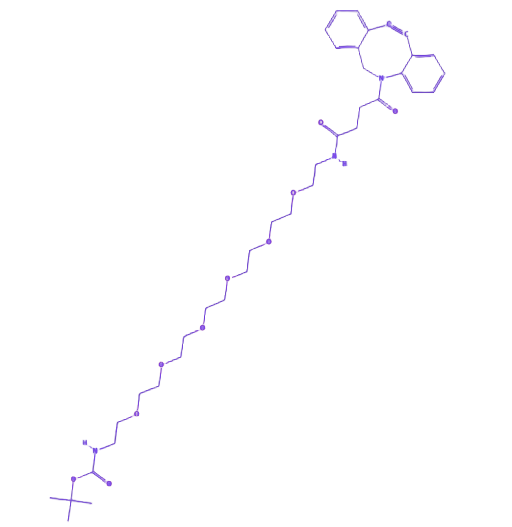该试剂的分子设计针对生物偶联的关键需求进行优化:DBCO 基团具备无铜点击化学反应特性,可在生理条件下与叠氮化物快速发生环加成反应,高效形成稳定的三唑共价键,避免铜催化剂对生物分子的氧化损伤及潜在细胞毒性;PEG6 链段由六个乙二醇单元构成,相较于短链 PEG 衍生物,其亲水性与空间位阻平衡更优,能显著提升修饰后生物分子的水溶性,减少疏水聚集及体内非特异性清除,延长循环半衰期;Boc 保护氨基可在温和酸性条件(如三氟乙酸TFA)下高效脱除,释放游离氨基用于后续功能化偶联,同时避免未保护氨基在前期反应中引发副反应,提高偶联效率与产物纯度。