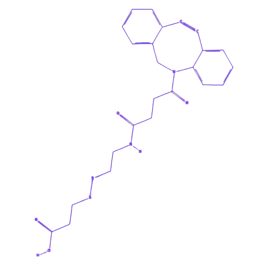 分子结构中包含羧基、DBCO 基团及二硫键(-S-S-)三大功能单元。羧基在 EDC、DCC 等活化剂作用下,能与含氨基、羟基的生物分子(如蛋白质、肽、小分子药物)形成稳定酰胺键或酯键,实现定向修饰;DBCO 基团通过无铜点击化学(SPAAC 反应)与叠氮修饰分子快速反应,无需金属催化剂即可在温和条件下形成稳定三唑键,有效避免金属残留对生物体系的干扰;二硫键赋予试剂可逆连接特性,可在还原剂(如 DTT、TCEP)或体内还原性微环境(如 tumour 组织高谷胱甘肽)中准确切割,实现修饰分子的可控释放。