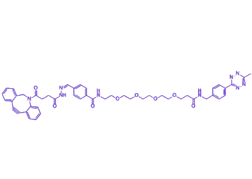 Methyltetrazine-PEG4-hydrazone-DBCO 是一种多官能团化的生物偶联试剂,通过整合甲基四嗪(Methyltetrazine)、二苯并环辛炔(DBCO)、聚乙二醇4(PEG4)链段及腙键(hydrazone)结构单元,实现了生物正交反应、亲水性调节与刺激响应性释放的多功能协同。其设计理念在于为生物分子偶联、靶向递送及材料修饰提供高效且可控的化学工具,尤其适用于复杂生物体系中的精准操作。