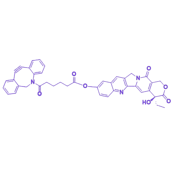 DBCO 片段赋予该化合物独特的 应变促进炔叠氮化物环加成(SPAAC) 反应活性,可在无铜催化条件下与含叠氮基团的生物分子(如蛋白质、核酸、纳米载体等)发生快速、高效、高特异性的共价偶联,为生物靶向递送系统构建、细胞成像分析及药物靶向修饰提供关键化学工具。10-羟基喜树碱作为母体活性单元,保留其通过抑制 拓扑异构酶 I 发挥的强效抗肿瘤药理活性,该天然产物的临床应用瓶颈主要在于水溶性差导致的生物利用度低及毒副作用问题。