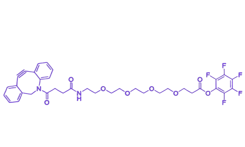 DBCO-PEG4-PFP ester 是一种由 二苯并环辛炔(DBCO)、聚乙二醇 4(PEG4) 和 五氟苯酯(PFP ester) 组成的生物偶联试剂,其设计兼顾高效反应性、生物相容性与结构稳定性,适用于复杂生物体系中的分子标记与偶联应用。 DBCO 基团具备 无铜点击化学活性,无需铜催化剂即可与叠氮基在温和条件下快速发生特异性环加成反应,有效避免金属离子对生物样本的潜在毒性,特别适用于活体生物分子标记、细胞内信号通路研究等场景。PEG4 链段较 PEG2 具有更长的亲水性间隔臂,可显著降低非特异性吸附,提升分子生物相容性,并延长其在体内的循环时间。PFP ester 作为高活性反应基团,在碱性条件下能与含氨基、羟基等亲核基团的生物分子迅速反应,形成稳定共价键,为生物偶联提供高效连接途径。 该试剂凭借独特的结构设计,在生物偶联物制备、生物材料表面功能化、药物-载体偶联等领域展现重要应用价值。建议在低温干燥、避光条件下储存,以保持其化学性质稳定。