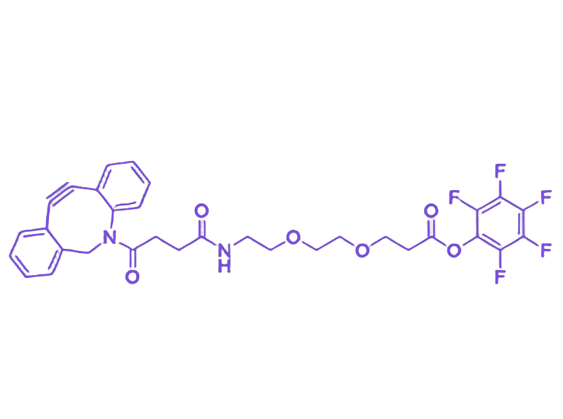 DBCO-PEG2-PFP ester 是一种三组分生物偶联试剂,由二苯并环辛炔(DBCO)基团、二聚乙二醇(PEG2)链段和五氟苯酚酯(PFP ester)末端基团构成,具备分步实施生物偶联的双功能特性,在生物分子修饰领域具有重要应用价值。 分子结构组成:该试剂分子包含三个关键功能单元。DBCO基团作为核心反应位点,可通过应变促进的炔-叠氮环加成反应与叠氮化合物实现高效偶联,此过程无需铜催化剂,特别适用于对金属离子敏感的生物体系。PEG2链段作为短链间隔臂,既能维持分子的亲水性,又能为偶联反应提供必要的构象自由度,减少空间位阻对反应的影响。末端的PFP酯基是高活性酰化试剂,其反应活性高于传统的N-羟基琥珀酰亚胺酯,可在温和碱性条件下与伯氨基快速反应形成稳定的酰胺键。 生物偶联机制:试剂的双功能特性支持分步偶联策略。首先利用PFP酯基与含氨基的目标分子反应,将DBCO基团高效引入目标分子结构;经纯化去除副产物后,通过DBCO与叠氮化合物的特异性点击化学反应,实现第二功能组分的精准连接。反应过程中,五氟苯酚作为离去基团,可通过液相色谱或质谱等分析手段对反应进度进行有效监测。 操作与储存要求:为确保试剂稳定性和反应效率,操作时需注意以下要点。建议在无水二甲基亚砜中配制储备液,并于-20°C条件下干燥避光保存。由于PFP酯基对水分高度敏感,所有操作必须在无水环境中进行。反应体系应严格控制pH值在7.5-8.5范围内,以获得最佳偶联效率,避免极端pH条件导致试剂降解或目标分子失活。