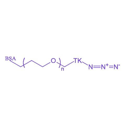 该材料的核心特性体现在模块化结构设计:BSA作为生物相容性载体,提供丰富的活性位点以结合生物分子;PEG链段通过空间位阻效应减少免疫原性,同时延长材料在体内的循环时间;TK键在肿瘤等还原性微环境中发生断裂,实现负载化合物的定点释放;N3基团可与炔基等发生高效点击化学反应,确保化合物的精准偶联。