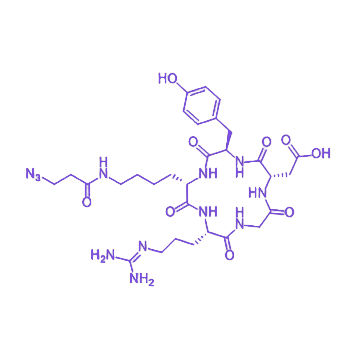 cRGD-N3 是一种融合生物活性序列与化学修饰位点的环状肽分子,其核心功能结构由 精氨酸-甘氨酸-天冬氨酸(RGD)序列构成,可特异性识别并结合细胞表面的 整合素受体,同时通过 环肽骨架提升分子稳定性与靶向结合效率,末端修饰的 叠氮基团(-N3)则为后续功能化修饰提供高效反应位点。 该分子的生物活性源于 RGD 序列与整合素受体的特异性相互作用,此结合模式是其参与细胞黏附、迁移等生理过程的分子基础。相较于线性肽结构,环肽构型通过限制构象自由度,减少酶解位点暴露,显著增强了在生物环境中的稳定性与代谢半衰期。叠氮基团的引入使该化合物可通过 点击化学(Click Chemistry)与含炔基的功能分子高效偶联,实现荧光标记、药物负载、纳米载体连接等多样化修饰需求,为构建靶向诊断探针或治疗递送系统提供模块化设计基础。