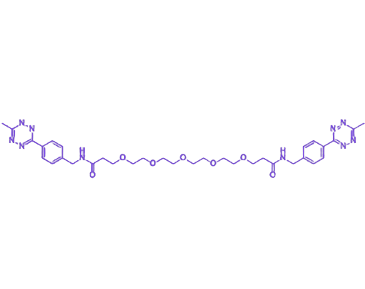 该试剂分子结构两端修饰 甲基四嗪(Methyltetrazine) 基团,相较于普通四嗪基团展现更高反应活性,可与 反式环辛烯(TCO) 在无催化剂条件下发生快速生物正交反应,尤其适用于活体生物分子标记、细胞内动态过程追踪等对反应速率要求严苛的研究场景。中间链段采用 聚乙二醇5(PEG5) 结构,赋予分子优异的亲水性与柔韧性,能有效降低非特异性吸附,提升生物相容性,并延长其在生物体内的循环半衰期。